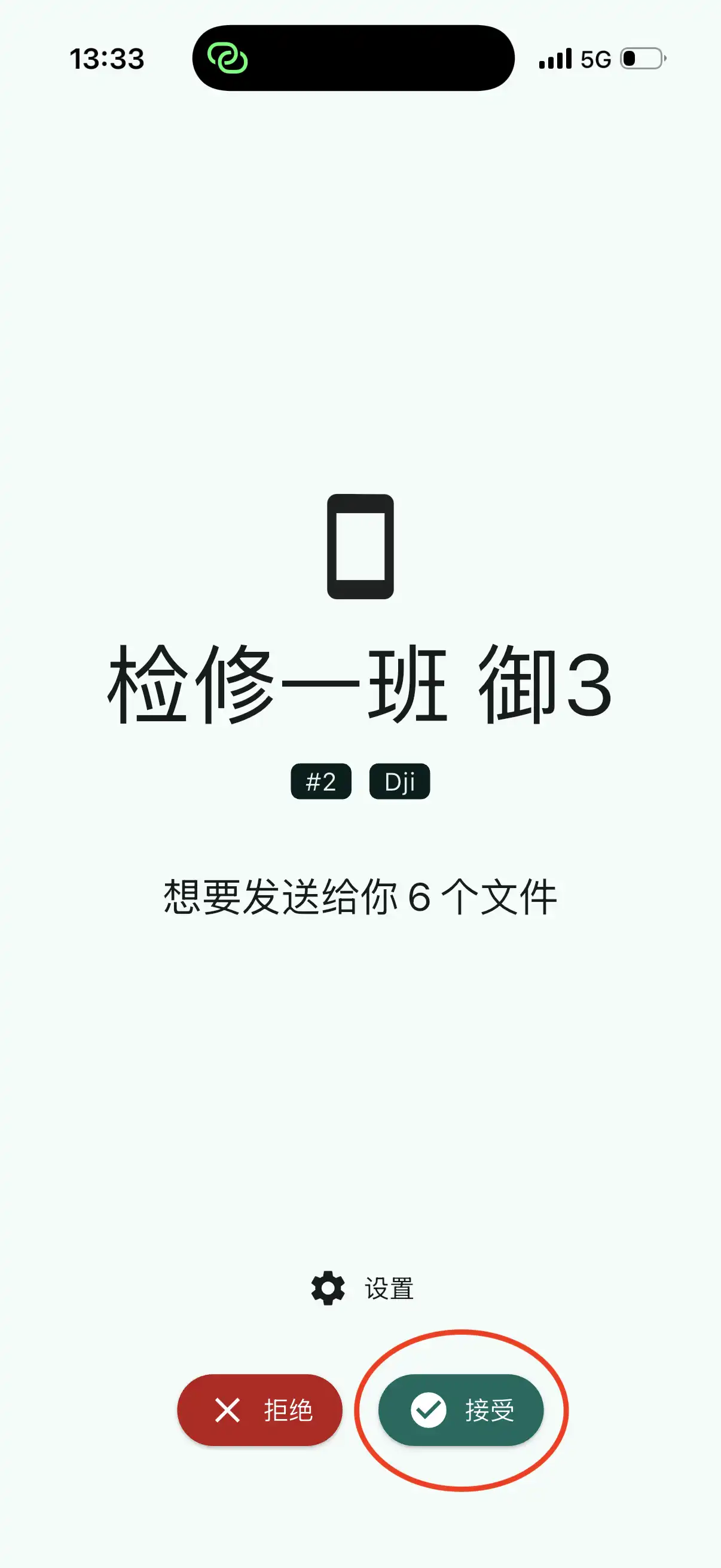 出现等待响应界面后 手机端 会弹出接收页面,请点击 接受: