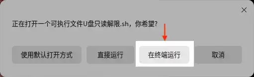 一、双击 “U盘只读解限.sh” ,弹出打开方式选择 “在终端运行” :